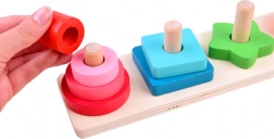 Înșirarea și așezarea pieselor pe țăruși antrenează priza, precizia mișcărilor și coordonarea mână–ochi.