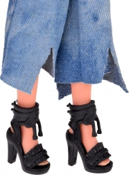 Topul roz cu model, blugii clasici și pantofii negri cu toc oferă păpușii un look modern pentru orice ocazie.