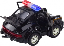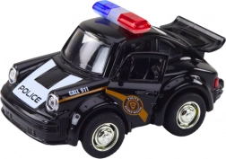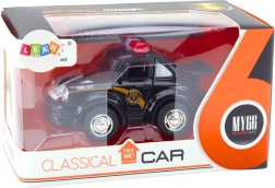 Această mașină de poliție neagră elegantă la scară 1:38 va fi apreciată de orice entuziast al mașinilor clasice. Este echipată cu propulsie inerțială, care permite o mișcare rapidă înainte dacă este trasă în spate.