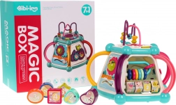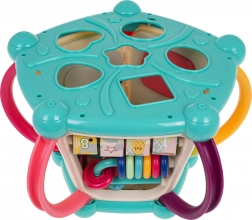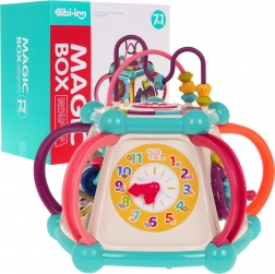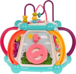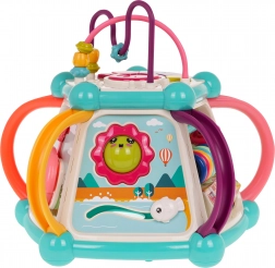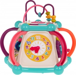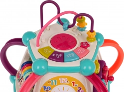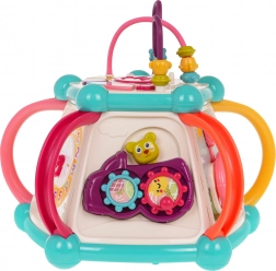 Această cubiță multifuncțională colorată este realizată din plastic de calitate, sigur, și este ideală pentru primele descoperiri ale lumii. Cele șapte fețe de joc oferă activități diverse: panou superior cu joc de potrivire, control al volumului în două trepte și pian cu sunete de cățel, pisicuță, oiță și rățușcă, fețe laterale cu abac, ceas cu ace, roți dințate și ursuleț, volan cu mașinuță și un peștișor cu soare distractiv. Partea inferioară ascunde un orificiu de sortare pentru forme și 6 cuburi colorate.