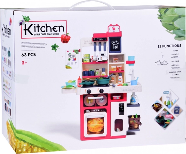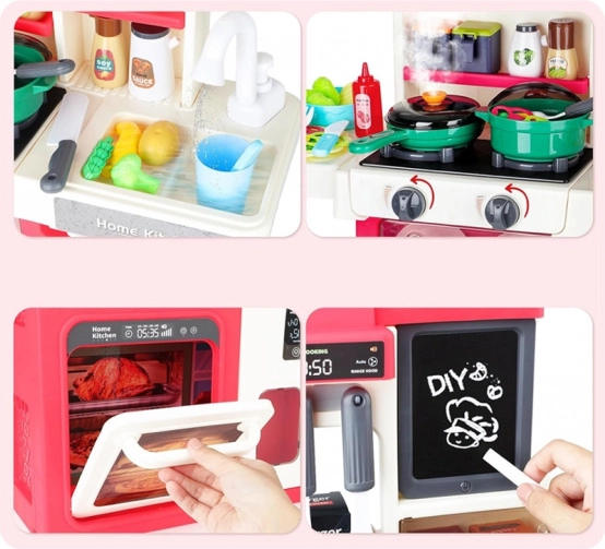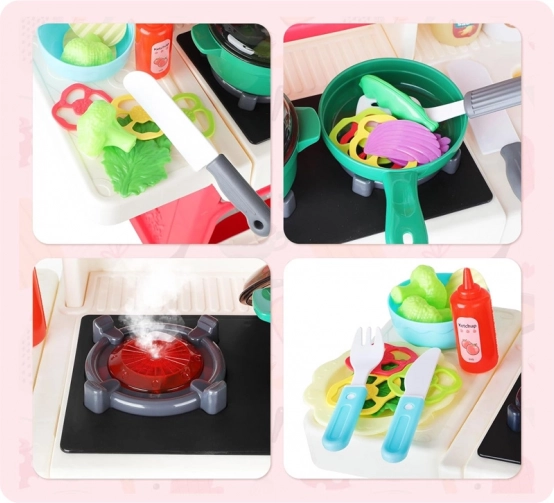 Bucătăria interactivă pentru copii în culori pastel este alegerea ideală pentru orice mic bucătar. Oferă multă distracție datorită numeroaselor elemente mobile și deschise, care captează atenția copiilor și oferă o alternativă sigură la bucătăria adevărată.