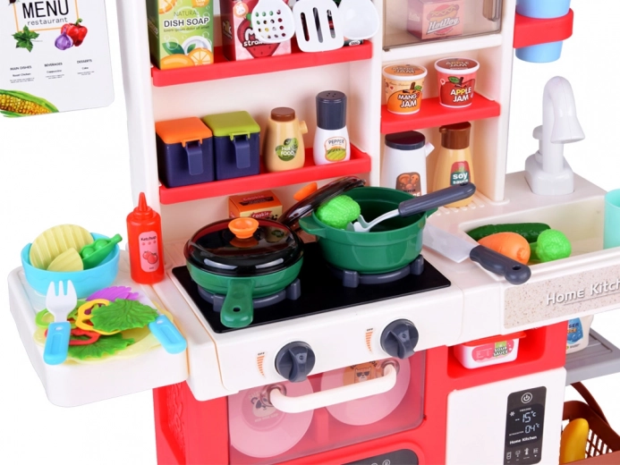 - Aragaz: Două ochiuri iluminate care, atunci când sunt rotite, luminează roșu și redau sunete de gătit. Posibilitatea de a adăuga apă pentru a simula aburul.