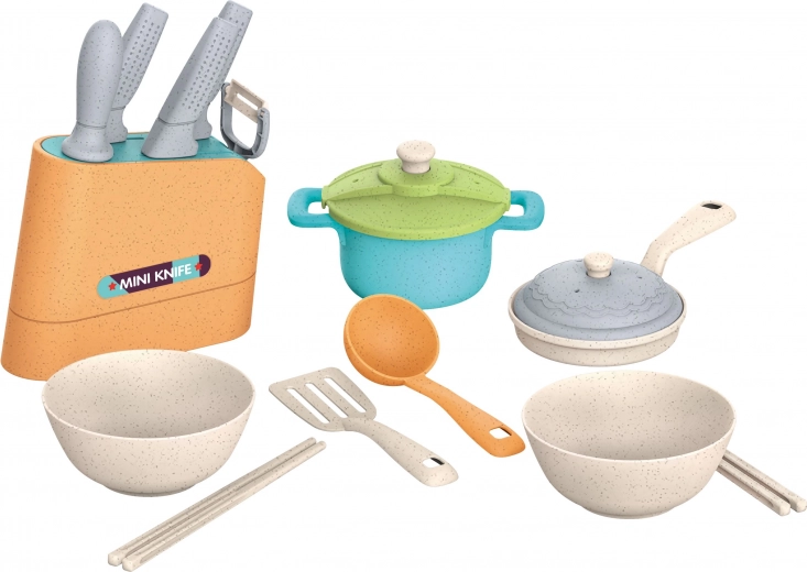Acest set de veselă de bucătărie a fost realizat cu grijă față de mediu, fiind ideal pentru învățare și distracție în bucătărie. Copiii se pot simți ca adevărați bucătari și pot contribui la un abord ecologic al gătitului: