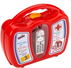 Acest set medical include tot ce este necesar pentru a te juca de-a doctorul: stetoscop roșu din plastic, telefon mobil de jucărie (necesită baterii care nu sunt incluse), seringă, termometru, foarfece, otoscop, ciocan, plasture, identificator, bentită de asistentă, cutie pentru tampoane de vată, rețetă și carnet de măsurători medicale. Geantă roșie este fabricată din plastic rezistent cu mâner confortabil și clemă galbenă pentru închidere sigură. Jucăria încurajează jocurile creative și ajută copiii să se obișnuiască cu vizitele la medic.