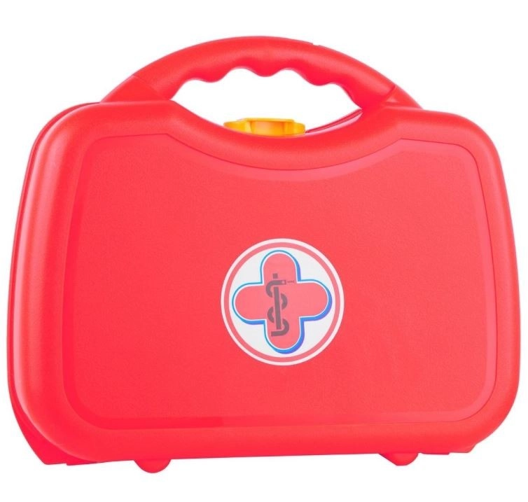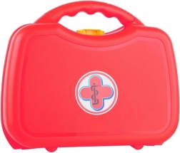 Setul în geantă conține echipamentul de bază necesar pentru orice cadru medical. Geanta roșie este realizată din plastic foarte rezistent, are un mâner confortabil pentru transport și o clemă galbenă împotriva deschiderii. Acest set mic conține până la 13 piese. Toate sunt, desigur, sigure pentru copii și ușor de folosit. Geanta include un stetoscop din plastic roșu și bleumarin, o foarfecă din plastic, pensetă, seringă, termometru, otoscop, ciocănel, cutiuță cu tampoane de vată, plasture, pensetă și un carnet de notițe. Toate obiectele sunt, desigur, sigure pentru copii și ușor de utilizat. Gama de seturi și accesorii medicale servește, pe de o parte, pentru jocul de-a doctorul sau asistenta, iar pe de altă parte îi ajută pe copii să se obișnuiască cu tema vizitei la medic, efectuării de consultații și intervenții. Este disponibilă o gamă largă de seturi cu mai mult sau mai puțin accesorii, precum și o serie de produse individuale, cum ar fi halate medicale și stetoscoape. Întreaga gamă este concepută vizual astfel încât să se potrivească atât băieților, cât și fetelor.