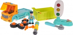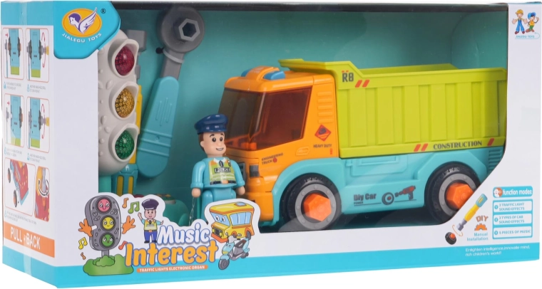 Setul include un semafor interactiv cu efecte luminoase (roșu, galben, verde) și sonore (melodii, claxon, pornirea motorului, alarme), care îi învață pe copii situații rutiere prin joc. Două șurubelnițe îi ajută pe cei mici să demonteze mașina pe piese și să o reasambleze – dezvoltând motricitatea fină, răbdarea și gândirea tehnică.