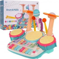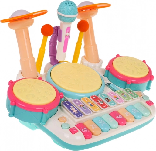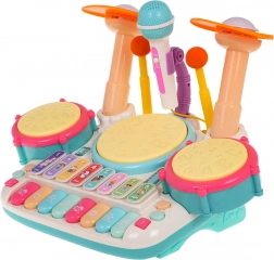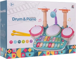 Set muzical interactiv, pian cu tobe pentru copii de la 3 ani. Jucăria muzicală este realizată din plastic de cea mai înaltă calitate, în culori vii, și sprijină copilul în joacă și învățarea instrumentelor muzicale. Jucăria combină instrumente de percuție și pian și este echipată cu microfon și sistem audio. Clapetele generează sunete de pian, trompetă, chitară, sunete de animale și denumiri ale numerelor. Trei tobe și cinelele se aprind la fiecare lovire cu bețele. Există și modul educațional, în care pe tobe se aprind lumini (o lumină, dublă, triplă – cu viteze diferite) și îl învață pe copil să bată ritmurile. Jucăria muzicală are control al volumului și intrare pentru microfon, care face parte din set. Jucăria este alimentată de 4 baterii AA 1,5 V (nu sunt incluse). . Funcțiile setului: . - destinat copiilor de la 3 ani, .- fabricat din plastic de cea mai înaltă calitate, .- fără margini ascuțite, .- culorile vii atrag privirea copiilor, .- tobe și cinele iluminate, .- microfon cu sonorizare, .- moduri de redare și învățare, .- sunete de pian, trompetă, chitară, animale, numere, .- control al volumului, .- intrare pentru microfon, . |