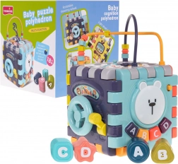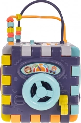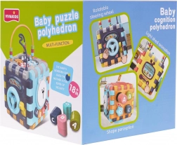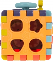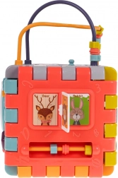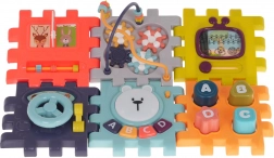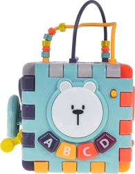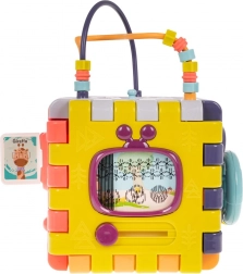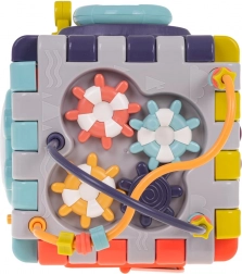 Partea superioară aduce roți dințate și mărgele pentru exersarea coordonării mână–ochi. Sorterul de forme cu 4 cuburi colorate susține recunoașterea formelor și gândirea logică. Cubul este realizat din plastic rezistent, în culori vii, iar prin execuția sa îi motivează pe cei mici să exploreze și să se joace independent.