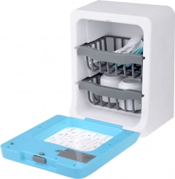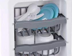Această mașină de spălat vase pentru copii aduce în joc elemente realiste: de la foșnetul apei și sunetul de clătire/sterilizare până la semnalizarea terminării programului. Datorită panoului tactil, micii ajutoare pot alege cu ușurință modul și timpul. Ușa rabatabilă și coșurile pe două niveluri permit introducerea comodă a farfuriilor, ceștilor și tacâmurilor.