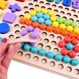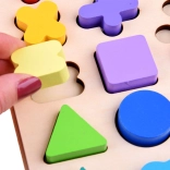 Planșa din lemn cu forme, cifre și simboluri îi învață pe copii asocierea corectă, recunoașterea formelor și stimulează gândirea logică în timpul aranjării.