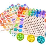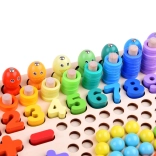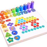 Acest set complex pentru camera copiilor aduce o paletă variată de jocuri și sarcini care susțin învățarea prin joacă. Cei mici exersează recunoașterea formelor și culorilor, învață cifrele și cantitățile, iar datorită undiței magnetice se bucură și de îndrăgitul pescuit. Sunt incluse și activități de aranjare a modelelor din mărgele și bile după șabloane – excelente pentru concentrare și răbdare.