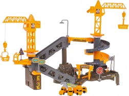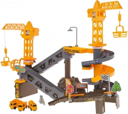 Include un set de mașinuțe mici de construcții, indicatoare rutiere, barieră și autocolante decorative pentru un șantier autentic.