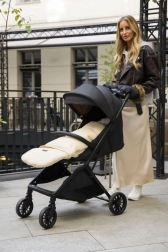 Datorită țesăturii impermeabile și fermoarelor pe ambele părți, reglați rapid confortul termic și accesul la copil. Gluga cu blană detașabilă adaugă protecție suplimentară împotriva vremii nefavorabile. Partea inferioară se poate desprinde dintr‑o mișcare și poate fi folosită ca mică geantă de mână pentru esențialele plimbărilor zilnice.