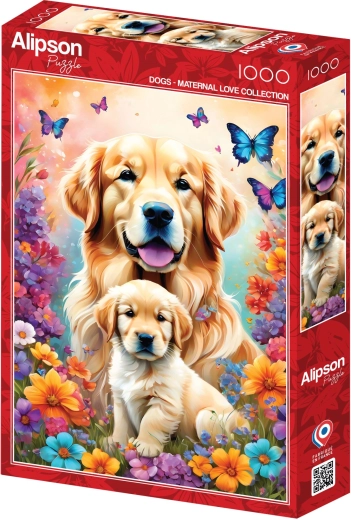 Puzzle „Dragoste maternă – Câini” de la Alipson este un puzzle superb de 1000 de piese, care surprinde un moment emoționant între o mamă câine și puiul ei. Înconjurați de flori colorate și fluturi, acești câini creează o imagine plină de iubire și armonie.