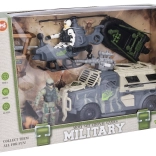 Set militar de acțiune pentru micii strategi, oferă ore de distracție pe uscat, în aer și pe apă. Include un vehicul de 25 cm, figurine de soldați și accesorii bogate. Pentru o experiență și mai intensă, are efecte luminoase și sonore activate prin butonul de pe arma vehiculului. Datorită roților libere, deplasarea este lină și pregătită pentru orice misiune.