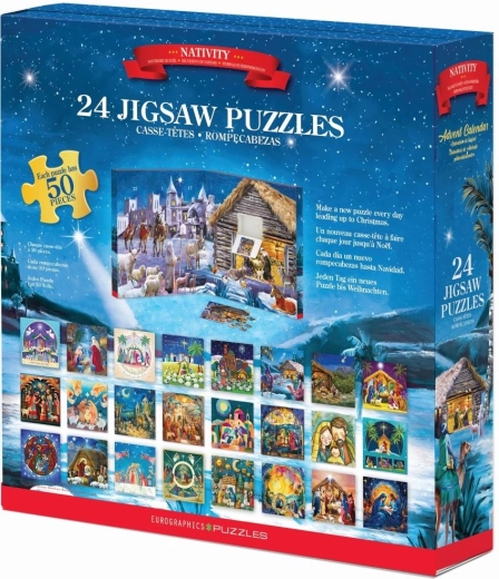 Bucurați-vă de magia Crăciunului cu calendarul de Advent puzzle de la EUROGRAPHICS și faceți așteptarea Ajunului mai plăcută. Calendarul conține 24 de imagini de Crăciun diferite, fiecare ca puzzle de 50 de piese în format pătrat 12,5 × 12,5 cm. Veți găsi 24 de ferestruici cu modelul imaginii, iar datorită construcției robuste este reutilizabil și pentru anul următor.