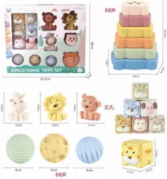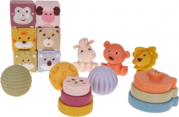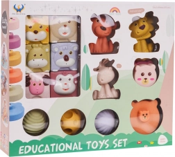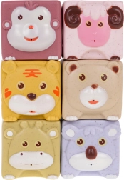 - 6 cuburi cu animăluțe: maimuță, oaie, tigru, urs, cerb, koala, fiecare cu textură și culoare diferite.