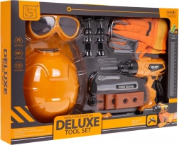 Set de unelte pentru copii, bogat echipat, pentru micii meșteri de la 3 ani, include cască, ochelari, mănuși, ciocan, șurubelniță, șuruburi și plăcuțe, precum și o bormașină cu acumulator interactivă cu sunete, pe 2× AA (nu sunt incluse). 20 de piese din plastic sigur susțin imaginația și motricitatea fină.