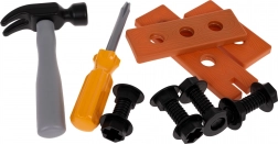 Ciocanul, șurubelnița, șuruburile, plăcuțele cu orificii și alte accesorii deschid spațiul pentru construcții libere, antrenarea motricității fine și dezvoltarea imaginației.