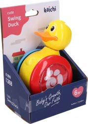 Rață colorată pe roți atrage atenția copiilor datorită mișcării balansată și sunetelor zornăitoare ale micilor bile.