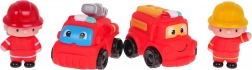 - Conținutul pachetului: pompier cu cască roșie, pompier cu cască galbenă, mașină de pompieri cu scară, mașină de pompieri cu furtun