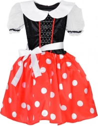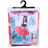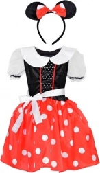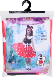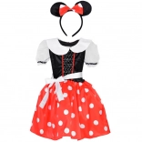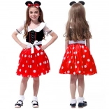 Un costum drăguț pentru fetițe, cu fustă roșie cu buline și corsaj negru cu guler alb, ideal pentru carnaval, petreceri de aniversare și spectacole școlare. Include și o bentiță cu urechiușe și fundă, care completează perfect ținuta. Costumul este confortabil de purtat, se îmbracă ușor și stimulează imaginația, jocul creativ și bucuria de a te costuma.