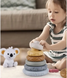 Pe lângă cele 13 mese și cuburi senzoriale, setul include și o jucărie adorabilă în formă de koala, care poate fi așezată pe cuburi, adăugând un plus de divertisment. Fiecare element al setului este proiectat pentru a oferi copilului stimulente senzoriale și sonore variate datorită modelelor în relief și a sunetelor delicate, pe care le emit cuburile în timpul manipulării.