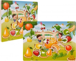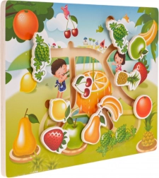 Acest puzzle din lemn este conceput pentru cei mai mici, care doresc să descopere lumea jucăriilor prin joc. Conține piese colorate care ilustrează diferite fructe, ce se inserează într-o placă din lemn.