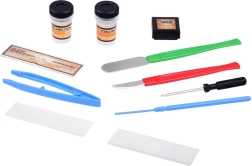 - Lama pregătită, 2× lamă pentru preparat, 2× recipient cu capac, cutie pentru probe, pensetă, spatulă, bisturiu, ac, șurubelniță, instrucțiuni
