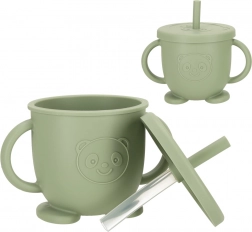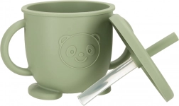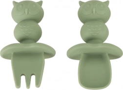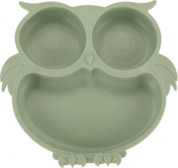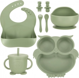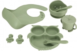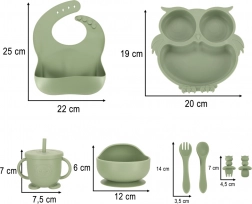Set practic și atrăgător de veselă din silicon, destinat copiilor. Conține tot ce are nevoie copilul dumneavoastră pentru o masă confortabilă și distractivă. Motivul cu bufniță în culoare verde militar este nu doar la modă, ci și pe placul fiecărui mic pofticios.