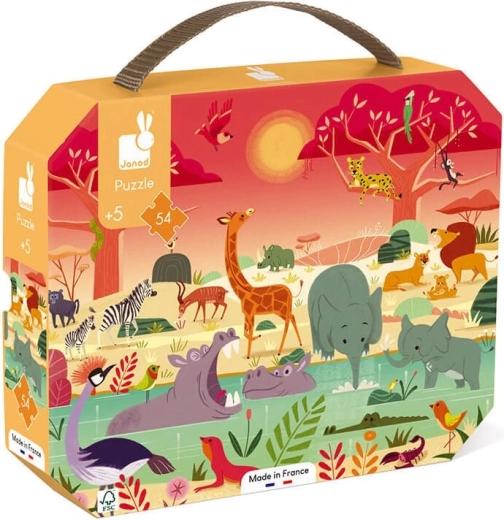 Puzzle JANOD cu imaginea savanei. Puzzle-ul este ambalat într-o valiză originală și practică, potrivită atât pentru acasă, cât și pentru călătorii. Pachetul include un poster-model. Dimensiunea puzzle-ului asamblat: aproximativ 50 x 40 cm