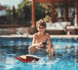 Senzorul integrat activează barca doar la contactul cu apa. Protejează electronica și este potrivit pentru copii.