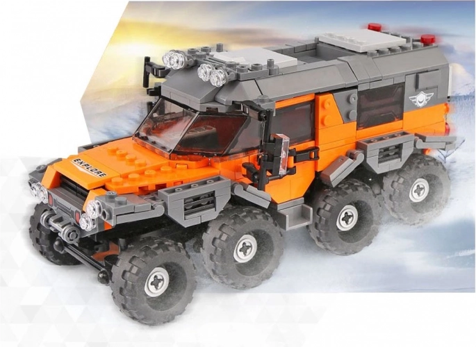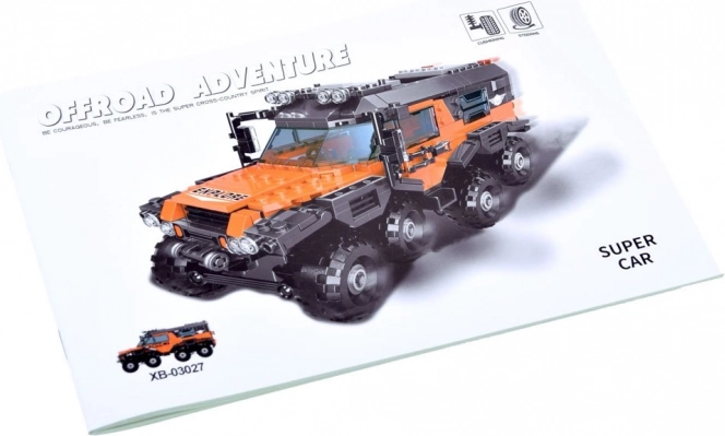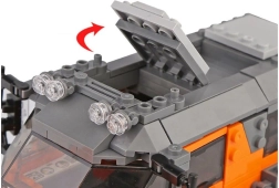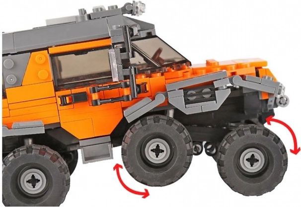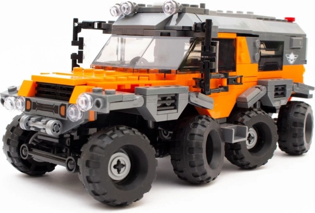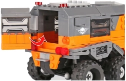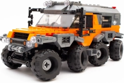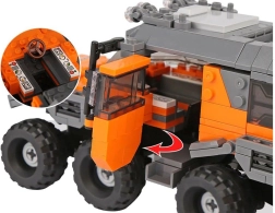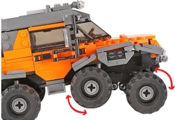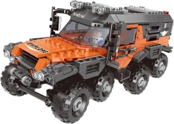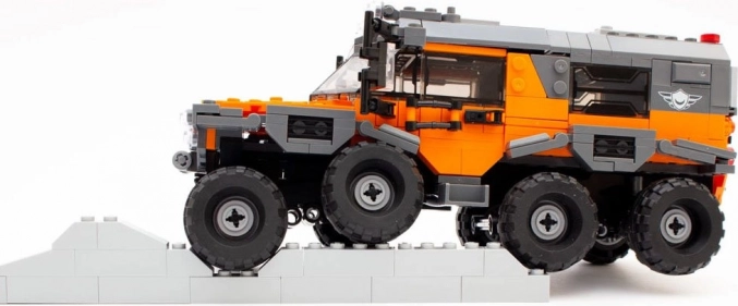 Această excelentă construcție este destinată asamblării unui vehicul de teren. Blocurile vă permit să construiți un vehicul cu 8 roți pentru misiuni speciale. Grozav este faptul că, după asamblare, vehiculul are părți mobile. Blocurile tehnice în culorile portocaliu și negru au fost realizate foarte efectuos.