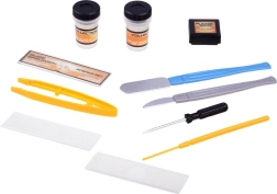 În pachet găsești lamele, recipiente pentru probe, pensetă, pipetă, bisturiu, ac și alte instrumente – totul pregătit pentru experimente acasă.