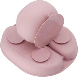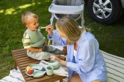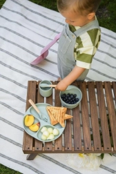 Marginile înălțate ale vaselor MoMi AMI îi facilitează copilului încărcarea alimentelor pe tacâmuri, iar farfuria compartimentată în trei secțiuni ajută la porționarea mâncării. Ventuzele anti-alunecare de sub bol și farfurie le mențin fixate în siguranță pe masă sau pe tava scaunului de hrănire.