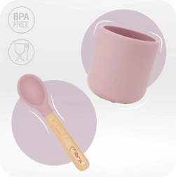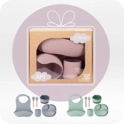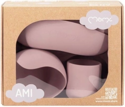 MoMi AMI este un set de veselă conceput pentru a-i ajuta pe cei mici să învețe să mănânce independent. Setul include: bol și farfurie cu ventuze, cănuță, tacâmuri cu mânere din lemn și un bavetă confortabilă și moale cu buzunar. Vesela MoMi AMI este confecționată din silicon sigur pentru contactul cu alimentele. Nu conține BPA și ftalați. Vesela este livrată într-o cutie cadou colorată!