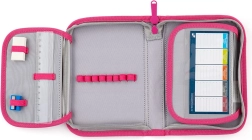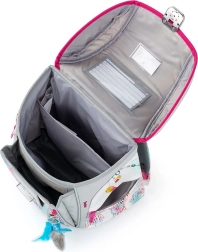 Compartimentarea bine gândită oferă suficient spațiu pentru manuale, caiete și gustare. Separatorul interior, mai multe buzunare și compartimente cu fermoar mențin ordinea pe tot parcursul zilei de școală. Setul include și un săculeț practic pentru sport cu șnururi de strângere și un penar cu un singur etaj, cu două clapete și bucle elastice.