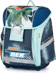 Setul școlar Premium Light dinozaur este alegerea ideală pentru clasele primare. Geanta ușoară, de doar 900 g, protejează spatele, iar datorită căptușelii ergonomice și respirabile și bretelelor late, buretate, oferă purtare confortabilă și stabilă. Curelele de strângere și cureaua de piept ajută la distribuirea corectă a greutății, în timp ce elementele reflectorizante sporesc vizibilitatea copilului.