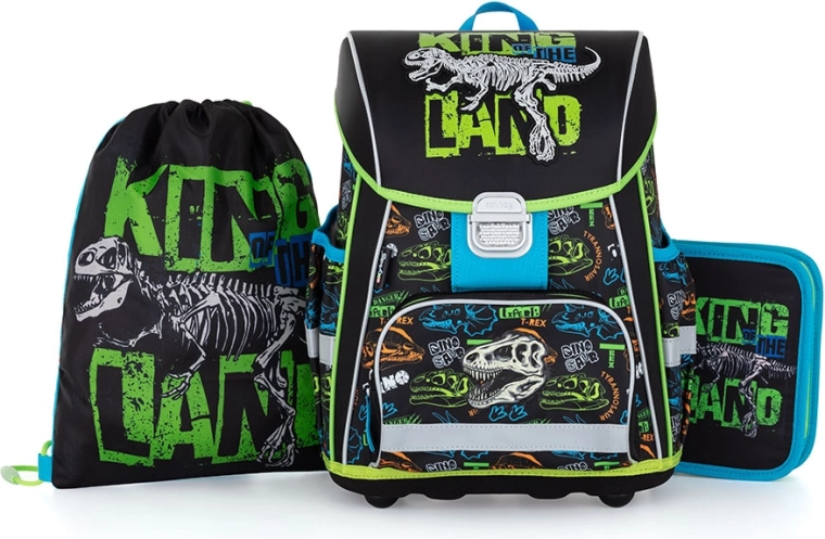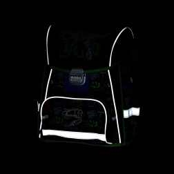 Ghiozdan: Ghiozdanul școlar din gama Premium are formă anatomică și asigură o așezare corectă pe spate. Spatele întărit și armătura interioară mențin forma stabilă a rucsacului. Căptușeala este din material plăcut și respirabil, bretelele late și buretate sunt concepute să se muleze perfect și să distribuie uniform greutatea pe umerii copilului. Ghiozdanul este alcătuit dintr-un singur compartiment spațios, în care încap confortabil toate rechizitele pentru copiii din clasa I și a II-a. Fundul rucsacului este din material rezistent, protejând conținutul împotriva răsturnării și vărsării. Închiderea este cu cataramă de siguranță. Buzunărelul frontal este destinat gustării, iar numeroasele elemente reflectorizante sporesc vizibilitatea ghiozdanului. Volum: 28 l. Capacitate de încărcare: 8 kg. Săculeț: Săculeț școlar pentru echipament sportiv, confecționat din material de calitate. Se închide prin strângerea șnururilor. Potrivit atât pentru școală, cât și pentru sport și alte activități de timp liber ale copiilor. Penar: Penar școlar cu un singur etaj și două clapete, fără conținut. Bucle elastice pentru fixarea instrumentelor de scris. Pe clapeta interioară se află o folie transparentă pentru orarul de la școală.