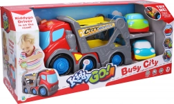 Set distractiv pentru micii șoferi: camion de remorcare Kiddy cu lungimea de 31 cm și două mașinuțe de 9 cm. Oferă efecte luminoase și sonore, roți libere pentru rulare lină și rampă rabatabilă cu două platforme pentru încărcare ușoară. Potrivit pentru copii de la 18 luni, bateriile 2× AA sunt incluse.