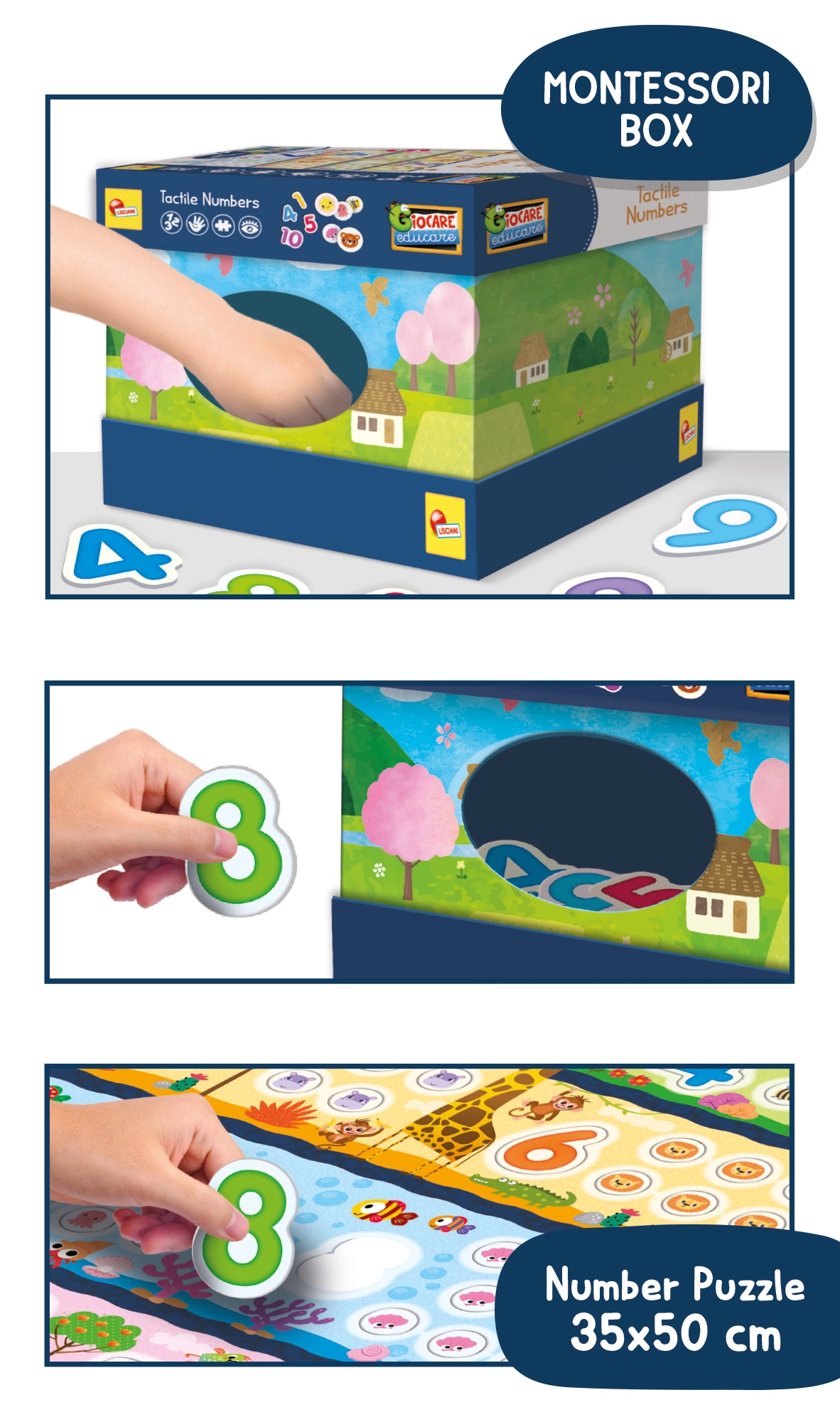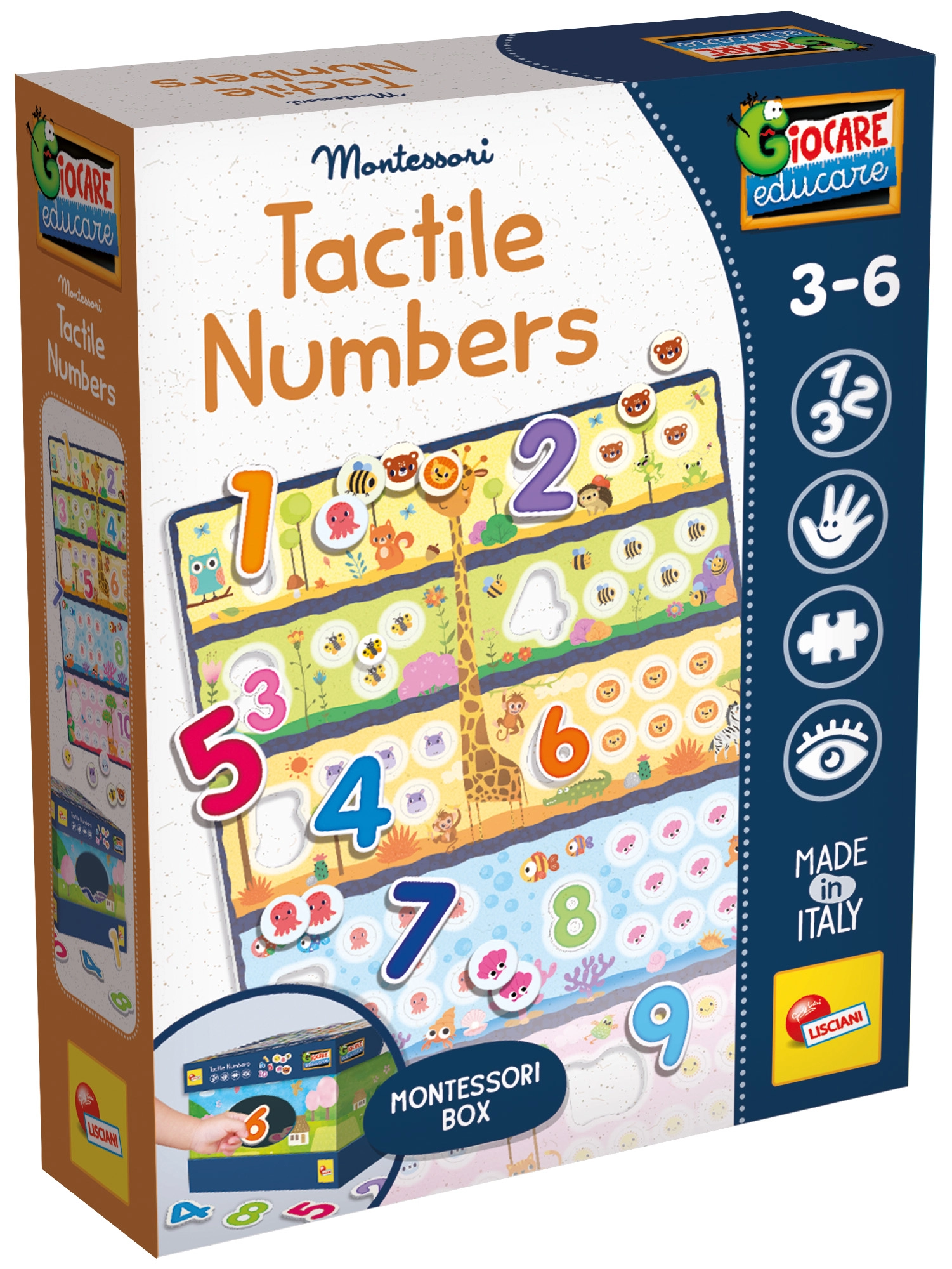 Jocul Montessori tactil cu numere este conceput pentru ca cei mici, încă de la vârste fragede, să descopere natural formele cifrelor prin atingere. Piesele în formă de cifre îi motivează să exploreze, să sorteze și să asambleze, susținând astfel concentrarea, memoria tactilă și coordonarea mână–ochi. Cutia practică facilitează depozitarea și menține ordinea.
