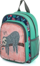 Acest rucsac vesel pentru preșcolari, cu motiv de leneș, va bucura orice copil. Datorită dimensiunilor sale compacte, este ideal pentru activități, excursii și grădiniță. Buzunarul frontal cu paiete oferă un look jucăuș și găzduiește mărunțișuri sau gustarea.