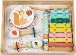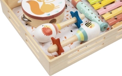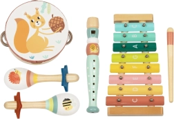 Setul conține instrumente precum tamburină, maracas și glockenspiel, care țin copiii ocupați și încurajează exprimarea de sine. Designul vesel cu animale ale pădurii atrage atenția copiilor și îi ajută să înțeleagă mai bine muzica.
