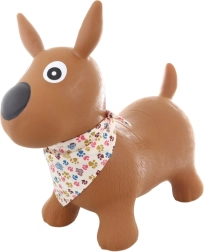 Hopsadlo din cauciuc în formă de căţel cu eşarfă, cu dimensiuni de aproximativ 54 x 47 x 25 cm. Înălţimea şeii este de aproximativ 24 cm. Dimensiunile ambalajului sunt de aproximativ 32,5 x 20 x 15 cm. Greutatea maximă suportată este de 50 kg. Pompiţa este inclusă în pachet. Vârsta 1+