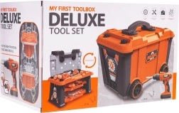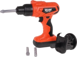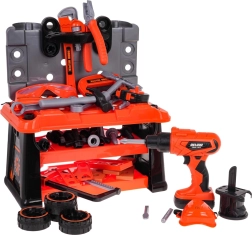Set 2 în 1 bine echipat pentru micii meșteri de la 3 ani. Din set puteți construi o bancă de lucru, iar după joacă o puteți transforma într-o trusă de scule, care face parte din set. Setul conține 65 de elemente, precum componente de atelier, unelte, fierăstrău, șurubelnițe, bormașină/șurubelniță cu baterii, multe șuruburi etc. Șurubelnița este alimentată de 2 baterii AA de 1,5 V, bateriile nu sunt incluse. Șurubelnița funcționează ca una reală: înșurubează, desfiletează, are și acumulator detașabil, 3 biți interschimbabili și un bit tip pânză de fierăstrău. |