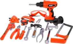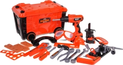 - trusă-atelier, .– șurubelniță electrică, .- mufă pentru șurubelniță, .- 3 x bit interschimbabil, .- burghiu cu pânză electrică, - ciocan, - șurubelniță plată, .- cheie fixă și cheie inelară, .- cheie, - cheie, - ochelari de protecție, .- mască de protecție, .- pahar gradat, - pânză de fierăstrău pentru lemn, .- clește, - fierăstrău manual, .- clemă, - ruletă, - 4 roți pentru trusă, .- 3 componente pentru înșurubat, .- șuruburi, - știfturi, .- piulițe. |
