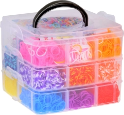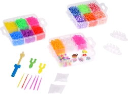 Descoperă lumea creației cu setul pentru brățări din elastice, cu o dotare bogată și până la 4500 de piese în 15 culori. Un organizator transparent practic, croșete, praștii, războaie de țesut și mărgele colorate le permit copiilor și adulților să creeze brățări, coliere și brelocuri originale. O distracție grozavă care dezvoltă creativitatea și motricitatea fină.