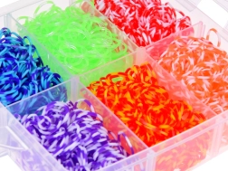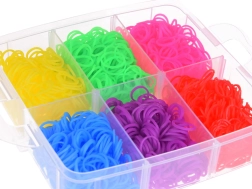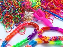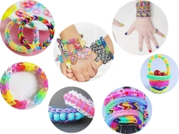 - cca 4500 buc. elastice, cârlige transparente de îmbinare, mărgele colorate/pastelate, 6× croșete mici, 1× croșetă mare, 2× praștie, 2× război de țesut, 6× breloc din silicon, organizator transparent cu compartimente