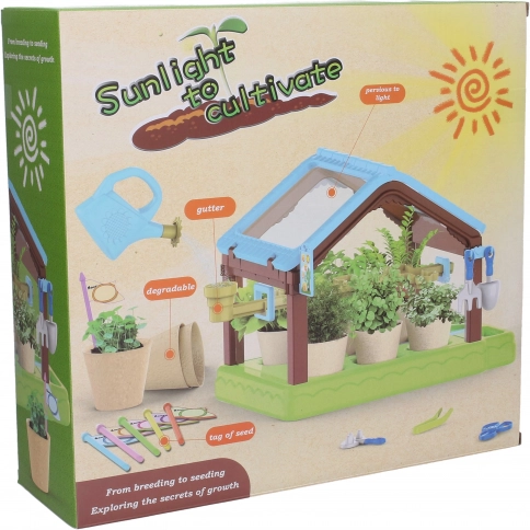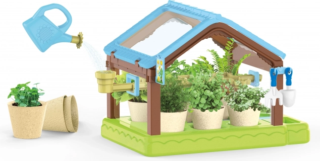 - seră, 6 ghivece, 4 pachete de sol, semințe, 6 etichete, stropitoare, pensetă, foarfece, lopățică, greblă, plug