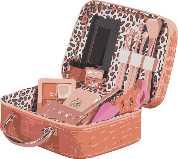 Geantă cu cosmetice. Dimensiune 19 cm. Conține oglindă, unghii false, luciu de buze, fard de obraz, fard de pleoape, pile pentru unghii, set de pensule, balsam de buze, tuș de ochi, decorațiuni sclipitoare.